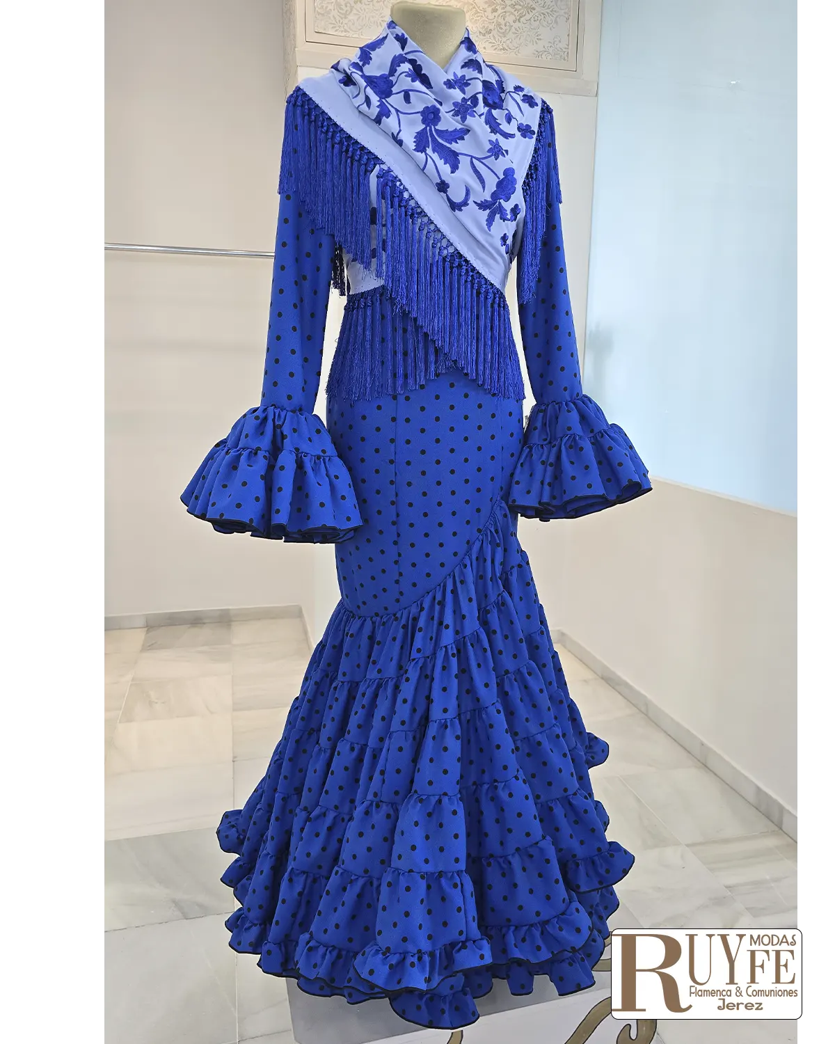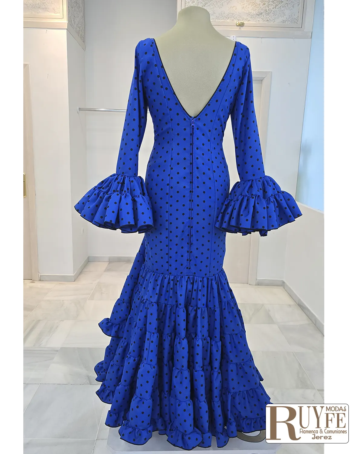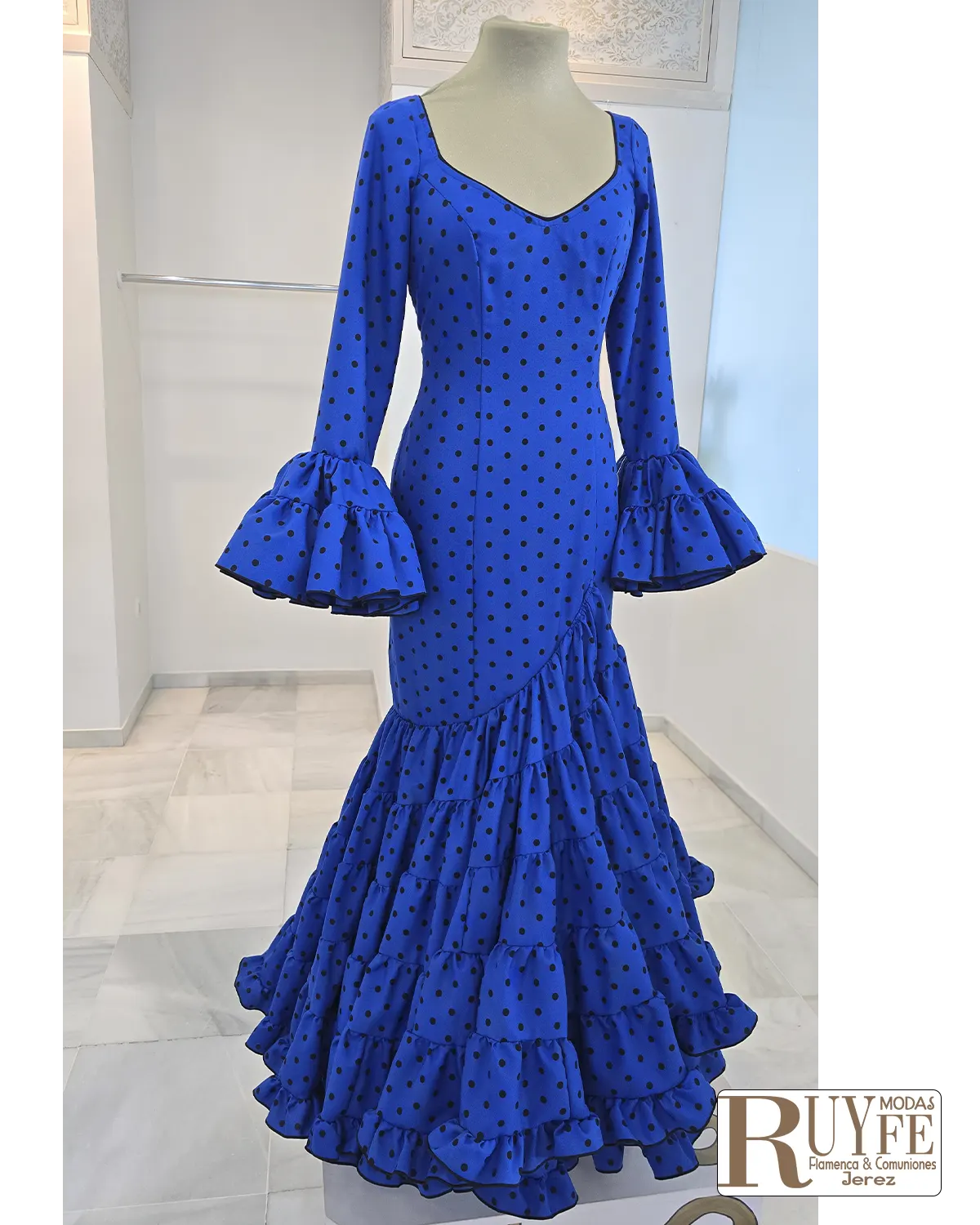 El elemento protagonista es su volante lateral con subida, un detalle elegante que atrae todas las miradas y aporta gran movilidad y fluidez al caminar, creando un conjunto armónico y lleno de estilo flamenco.